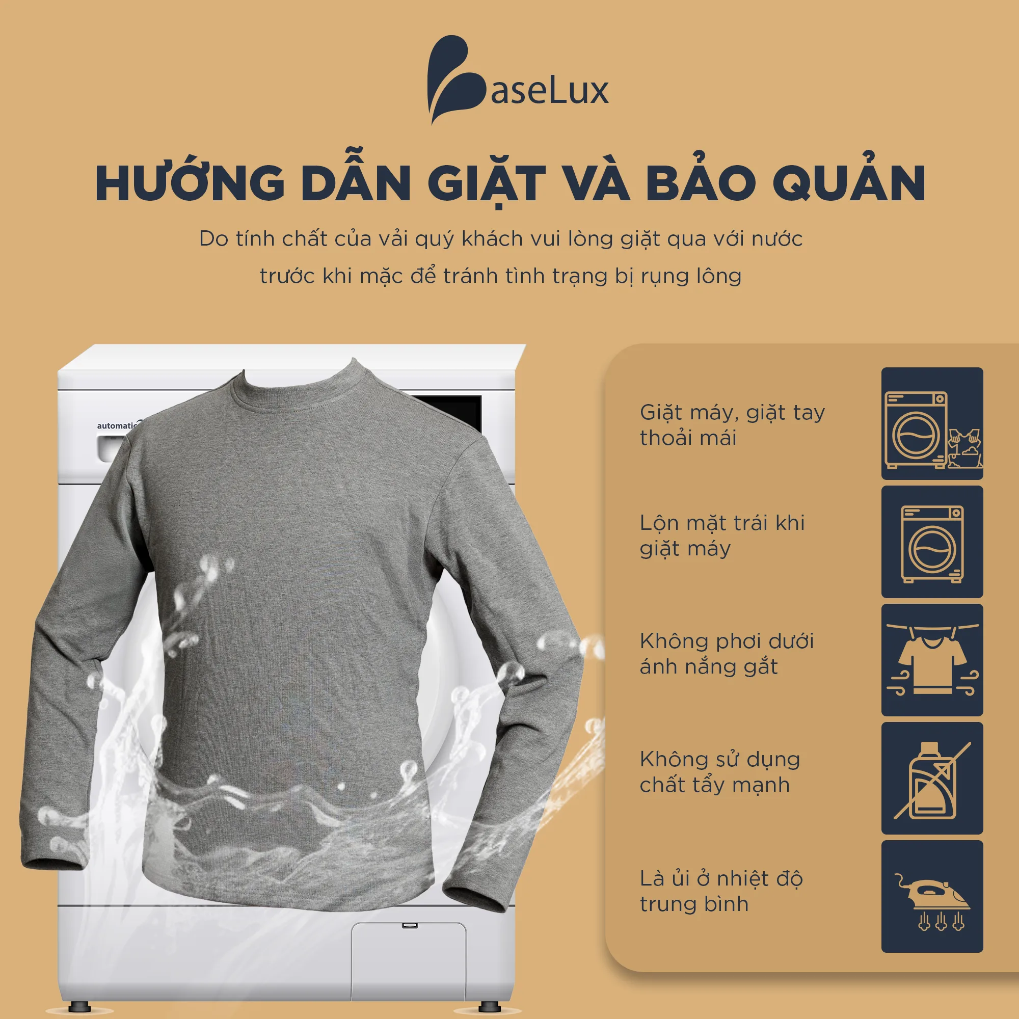 ✔ Lộn trái khi giặt để giữ màu tốt hơn
